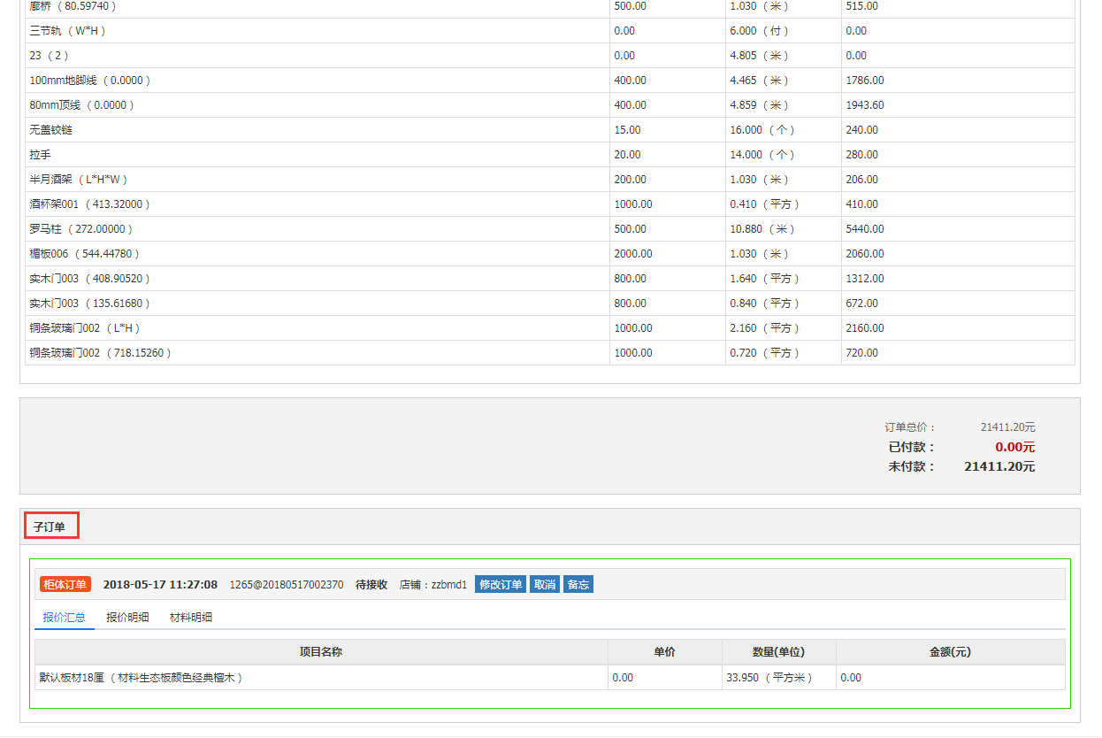 如果工厂选择接收该子单,则要先进行板材对应和计算报价,这样才能够显示该笔订单加工需要多少费用;