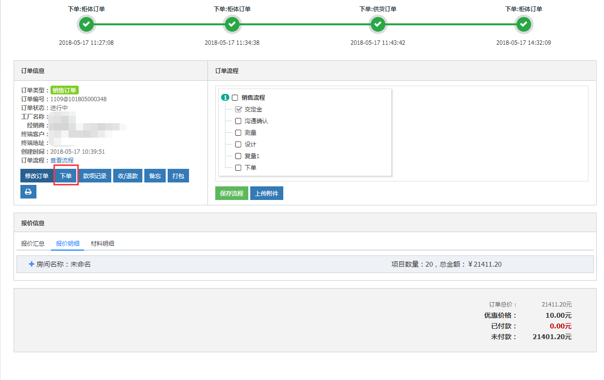 订单详情页包含订单信息、订单流程、报价信息,如果有子订单则也会显示子订单信息