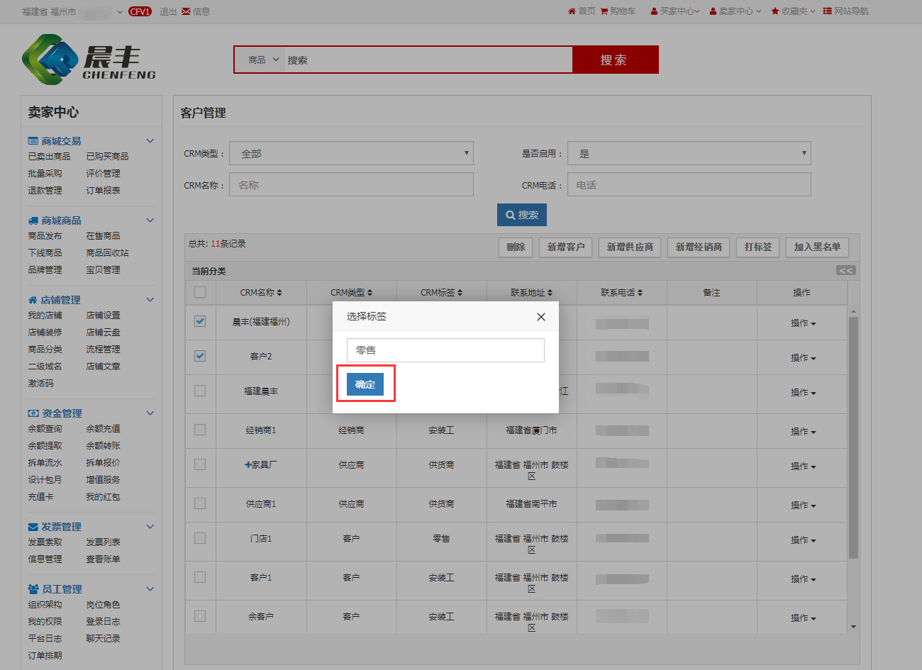 对于新增订单页面添加的客户和经销商,用户可在客户管理中对其进行打标签,选择客户或者经销商,点击打标签