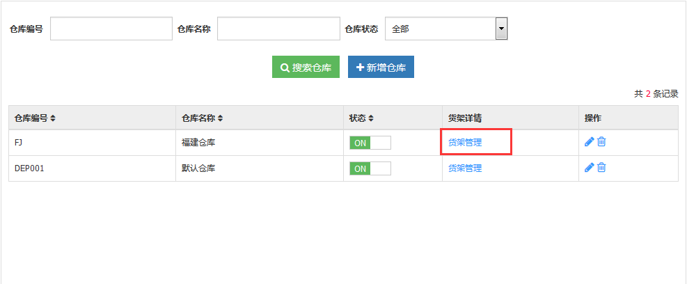 选择仓库,点击货架管理