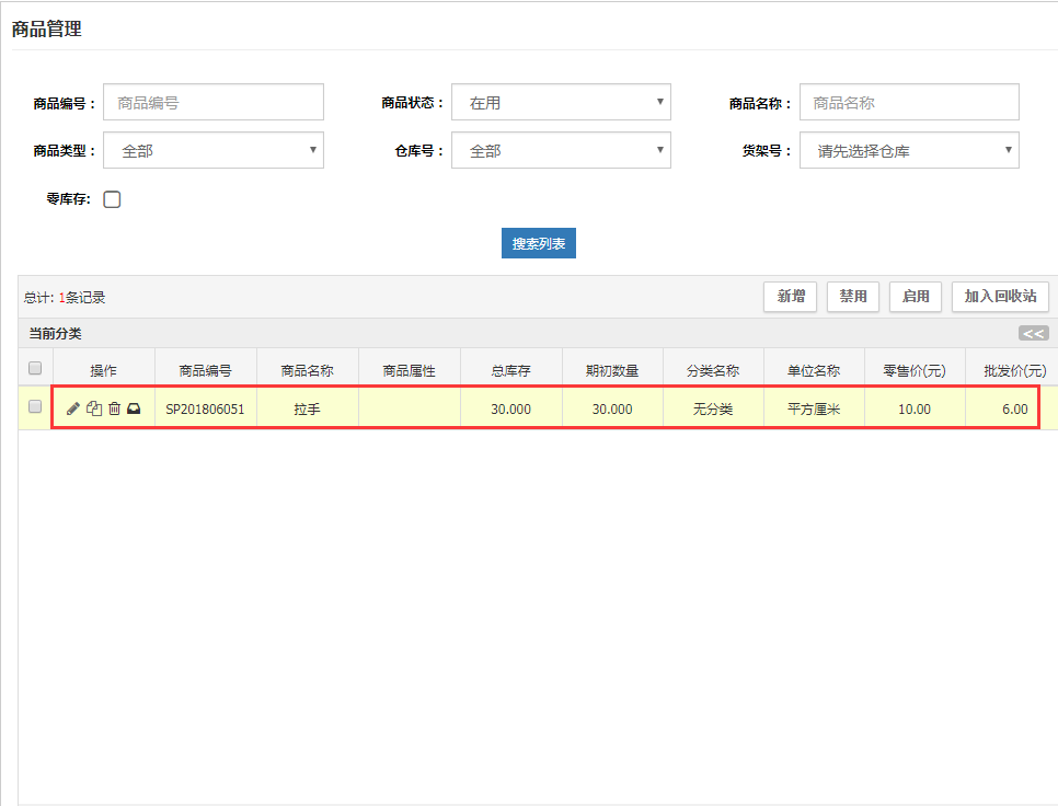 由于在新增商品,XX仓库已库存30,那么用户可以在初期进行设置初期数量,单位成本,初期总价;