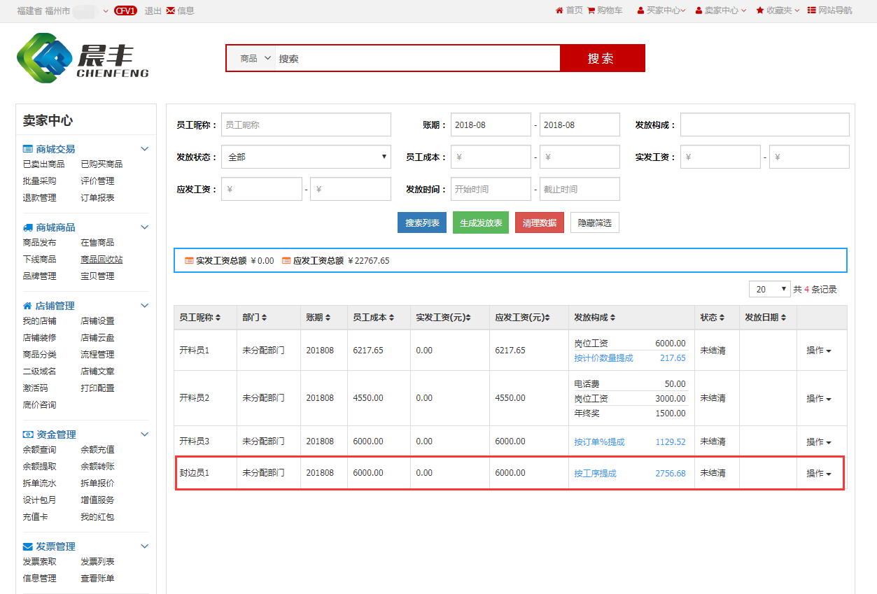 在平台的薪资发放中更新发放表,可查看封边员1的薪资构成发生变化