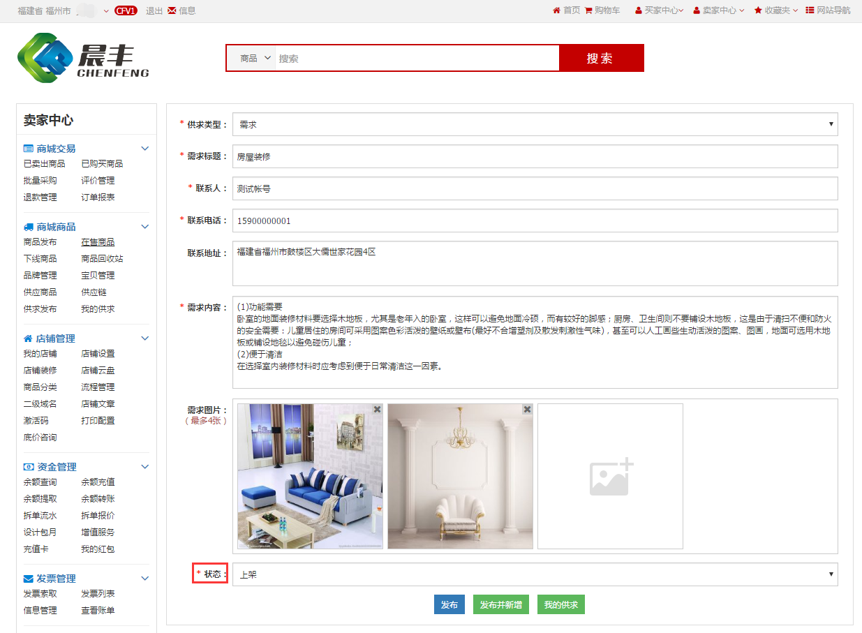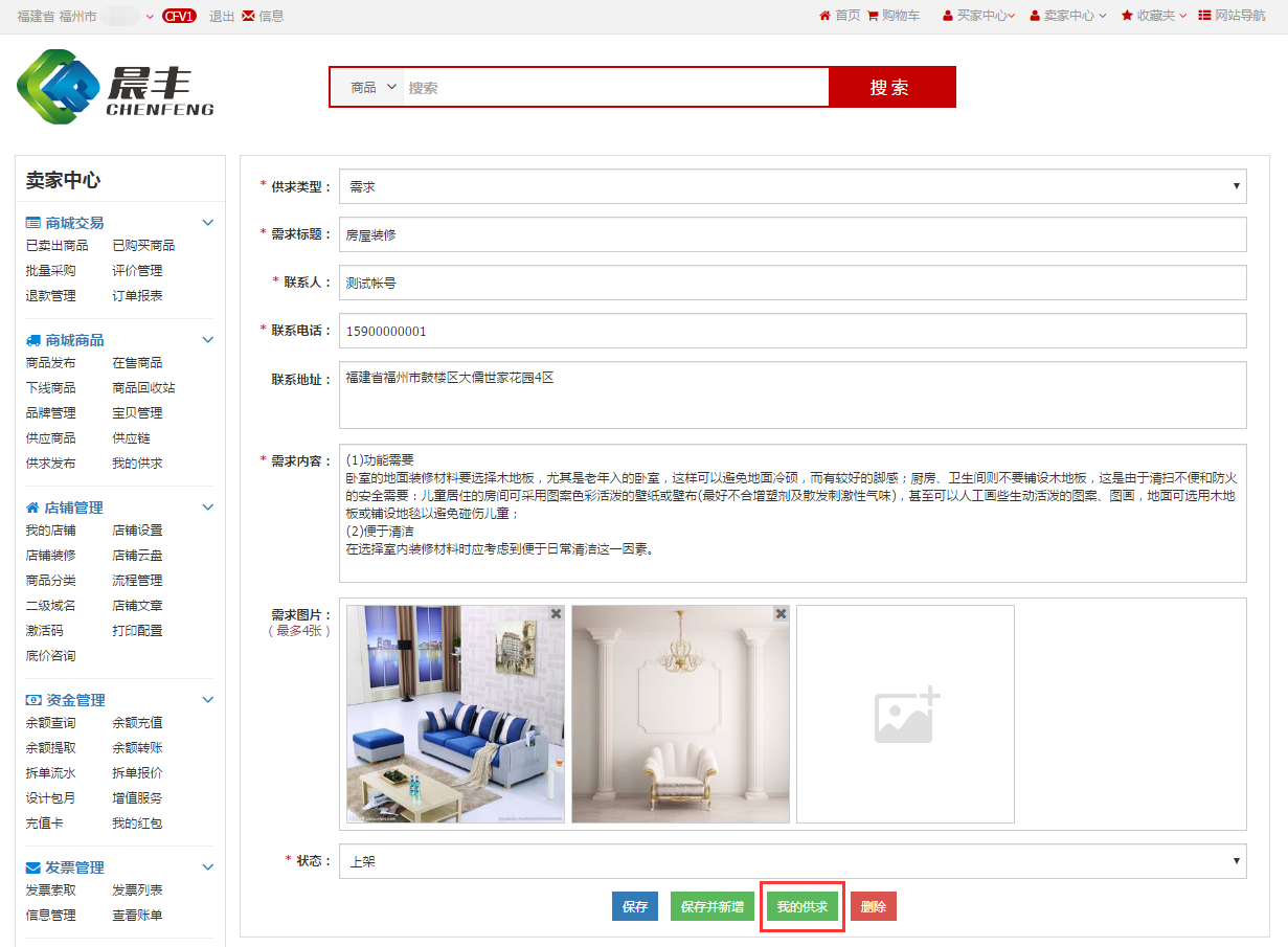 用户也可在手机端进行发布供求,在晨丰微信公众号,点击晨丰爱家-供应链