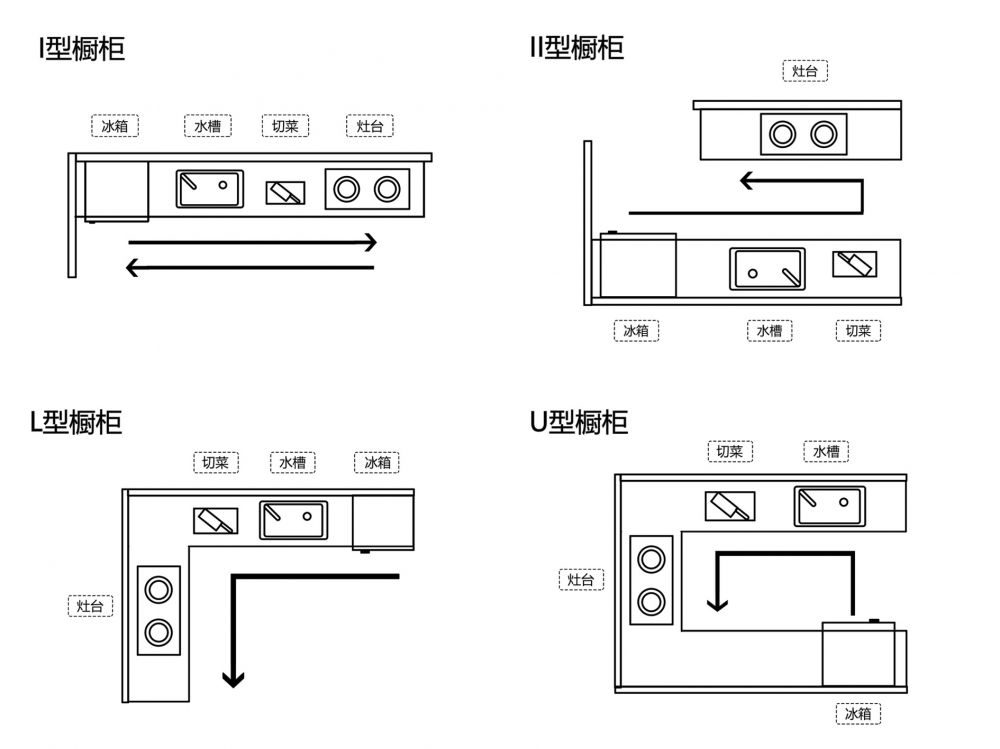 四种常见类型橱柜:L型、Ⅰ型、II 型、U型橱柜