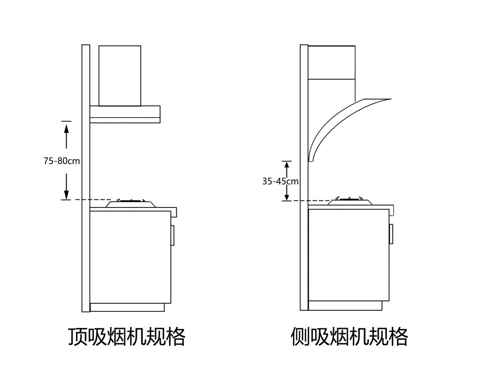 3、烟机的高度:烟机离灶台的有效吸烟距离,一般参考标准是吸顶烟机距离台面75-80CM,侧吸烟机在35-45CM。