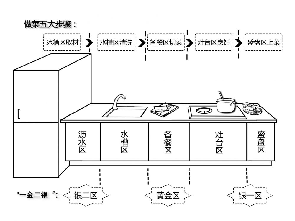 冰箱区取食材 水槽区清洗 备餐区切菜 灶台区烹饪 盛盘上菜区