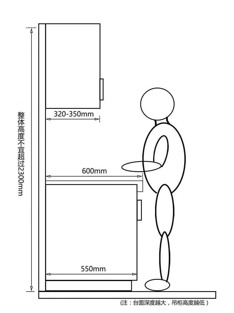 台面参考深度为60CM,地柜的深度60CM,吊柜的深度32-35CM,吊柜的深度不宜太深,大于35CM以上取物会不太方便。