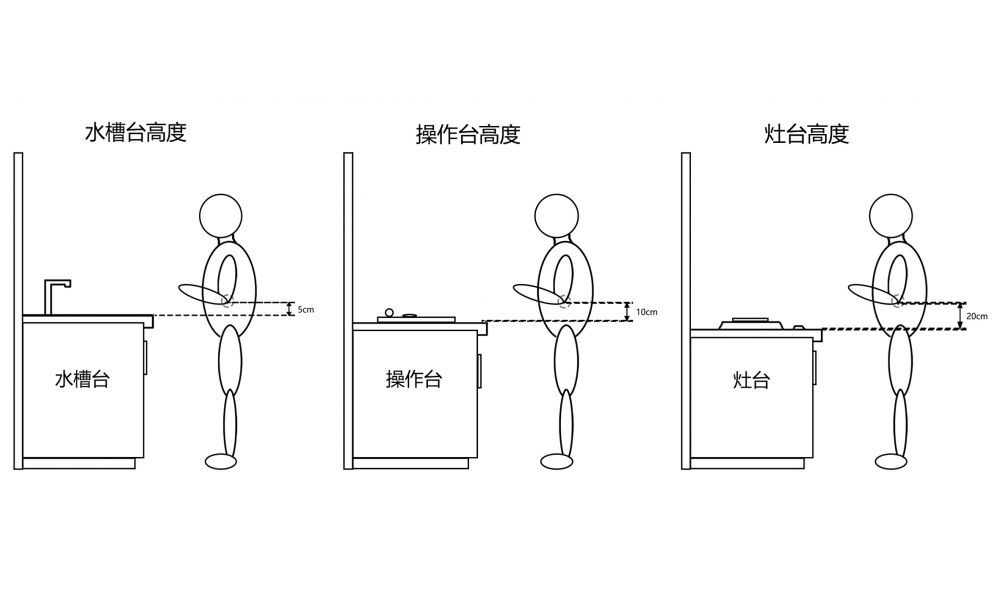 根据功能分区考虑,水槽、操作台和灶台的高度为:水槽台面在手肘以下5CM为佳,操作台以下10CM,灶台以下20CM。