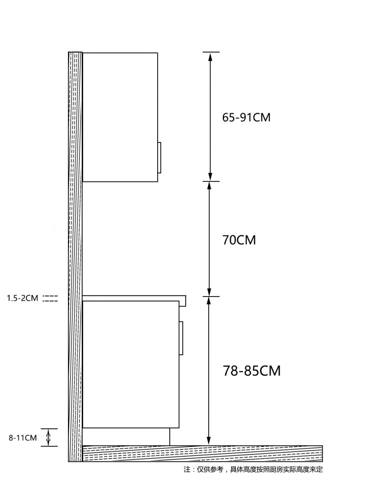 (注意:吊柜的高度和台面的深度有关系,台面深度越大,吊柜的高度越低,比如台面深70CM,那么吊柜距离台面的高度以50CM为佳。)