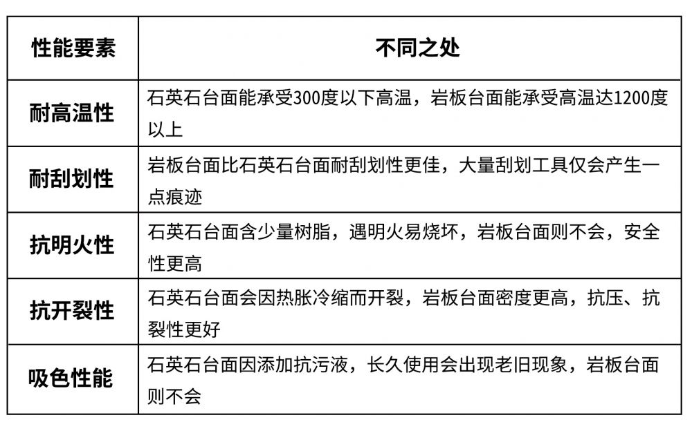 (3)性能优越度不同:岩板台面在某些性能上,会比石英石台面更加优越