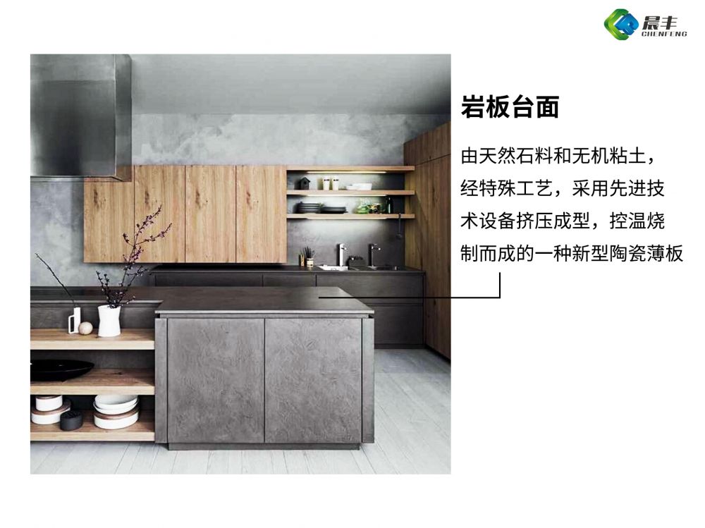 岩板台面:由天然石料和无机粘土,经特殊工艺,采用先进技术设备挤压成型,控温烧制而成的一种新型陶瓷薄板。