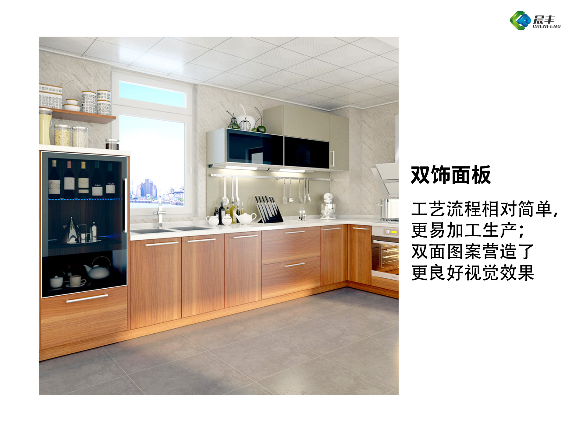 橱柜双饰面板材可做造型的几率很低,对于追求时尚,喜好雕刻艺术或是不喜简约线条的消费群体来说,并非算是一个好选择,但对造型外观要求不高,又喜双面图饰效果的群体来说,该板材的其它多样性优点值得被选择。