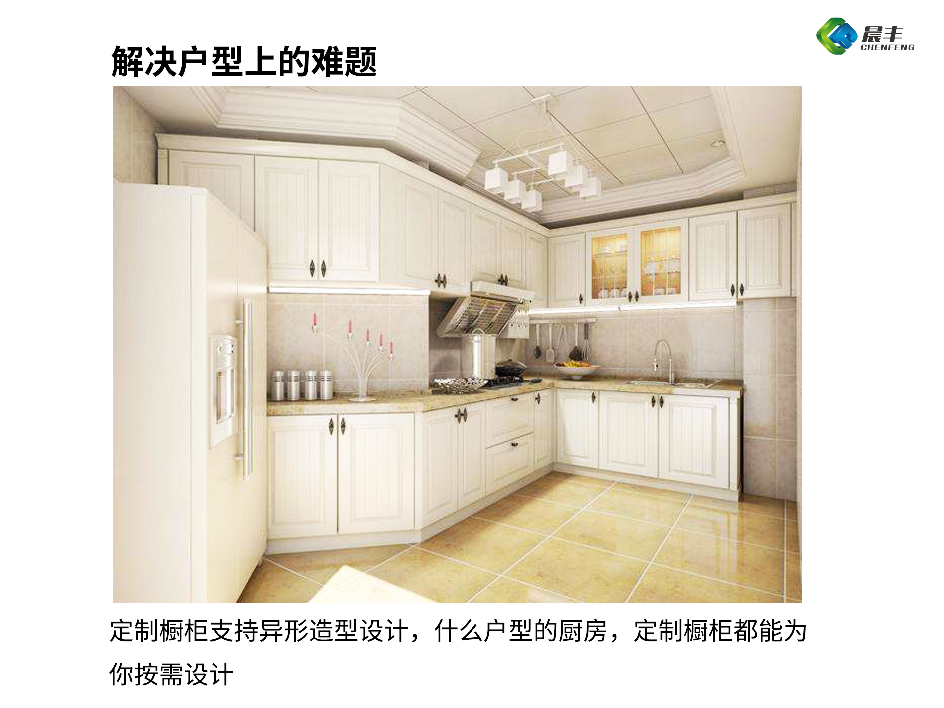 一些户型的厨房会存在圆弧型,以及一些其它异形的现象,这直接导致橱柜难以购买。而定制橱柜不仅支持异形造型设计,在对接生产上也可以说是毫无压力。什么户型的厨房,定制橱柜都能为你按需设计。